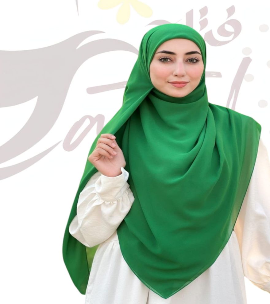 أبرزي نعومتكِ الطبيعية مع خمار شيفون ماليزي مربع بلونه الأخضر الزرعي الهادئ والمريح للعين، بمقاس (150 × 150 سم) الذي يمنحكِ حرية في اللف والارتداء.