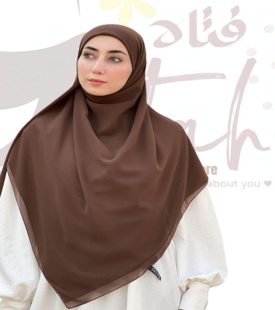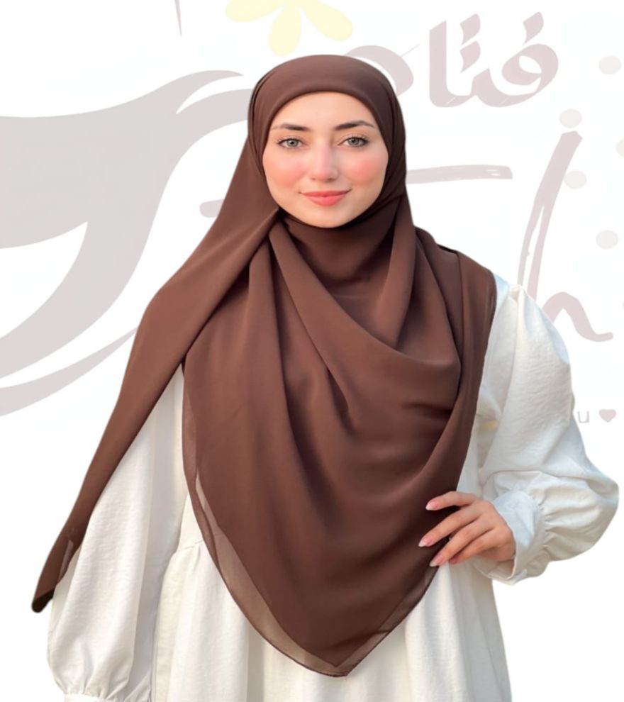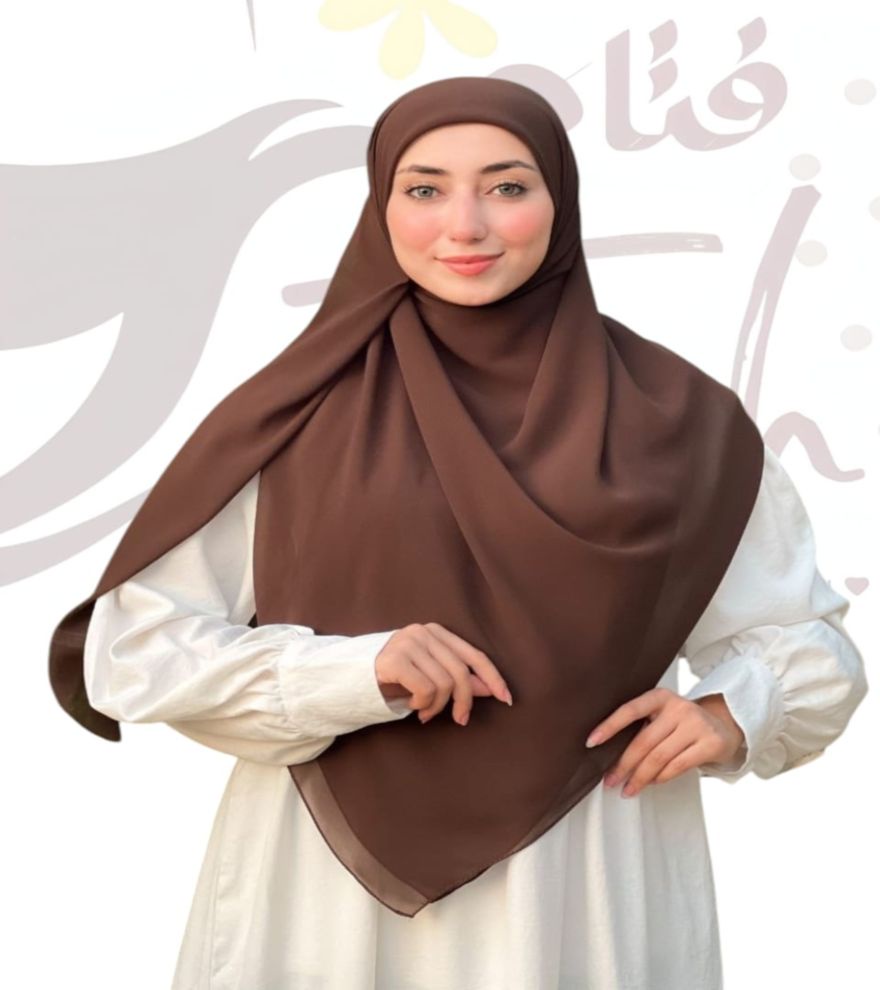 خمار بني غامق ماليزي شيفون ناعم – تصميم مربع 150×150 سم، لون أنيق وفخم، مثالي للإطلالات اليومية والمناسبات، خامة خفيفة وانسيابية بإطلالة راقية تدوم.