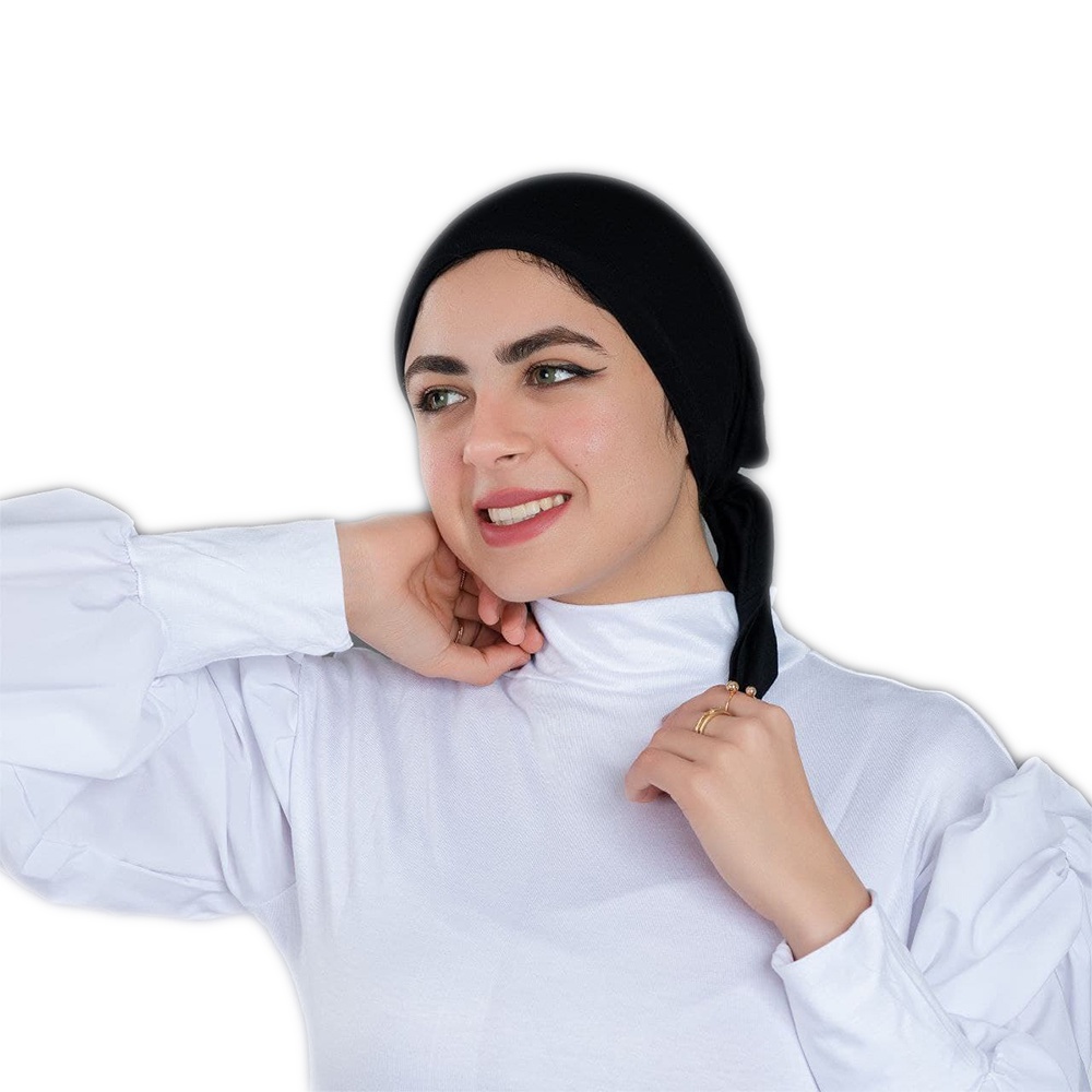 اكتشفي الراحة مع بندانة رباط قطن ليكرا باللون الأسود. خامة ناعمة، مرنة، وتثبيت مثالي طوال اليوم. مثالية تحت الطرح بجميع أنواعها.