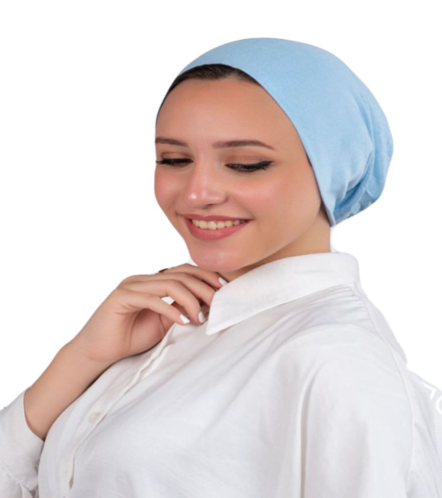 تمتعي ببندانة بونيه بدون خياطة بلون أزرق سماوي منعش، مصنوعة من قطن ليكرا ناعم ومرن يوفر راحة وثبات طوال اليوم. مثالية للمحجبات الباحثات عن أناقة وعملية في قطعة واحدة.