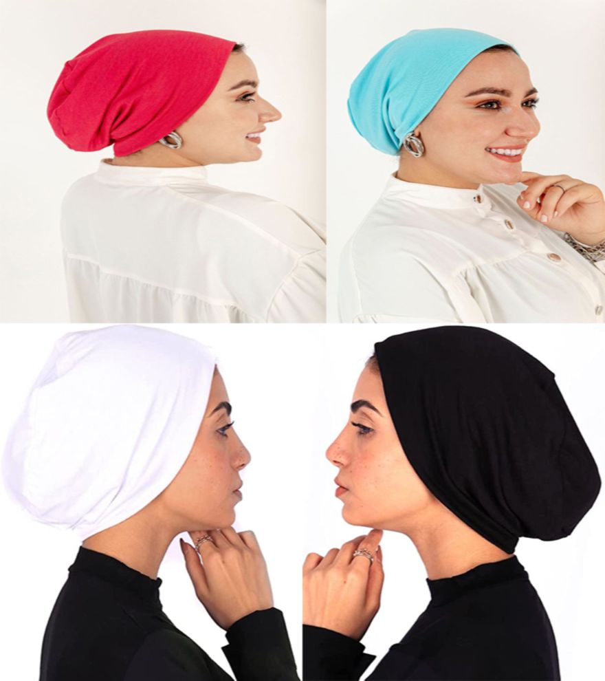 مجموعة من 4 بندانه بونيه قطن ليكرا بدون خياطة، تصميم مريح وألوان عصرية مثالية للمحجبات. خامة ناعمة، ثابتة ومناسبة لكل الاستخدامات.