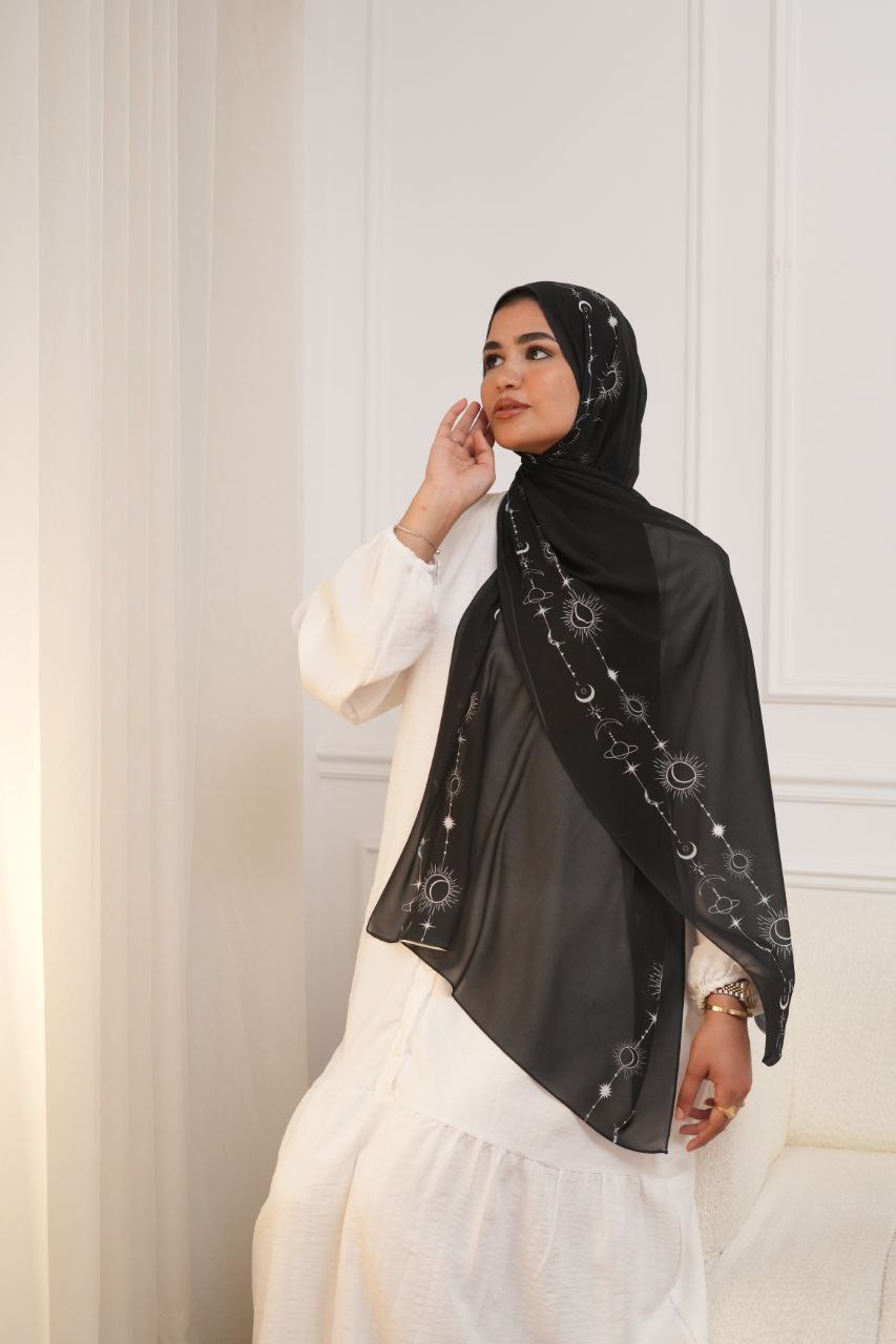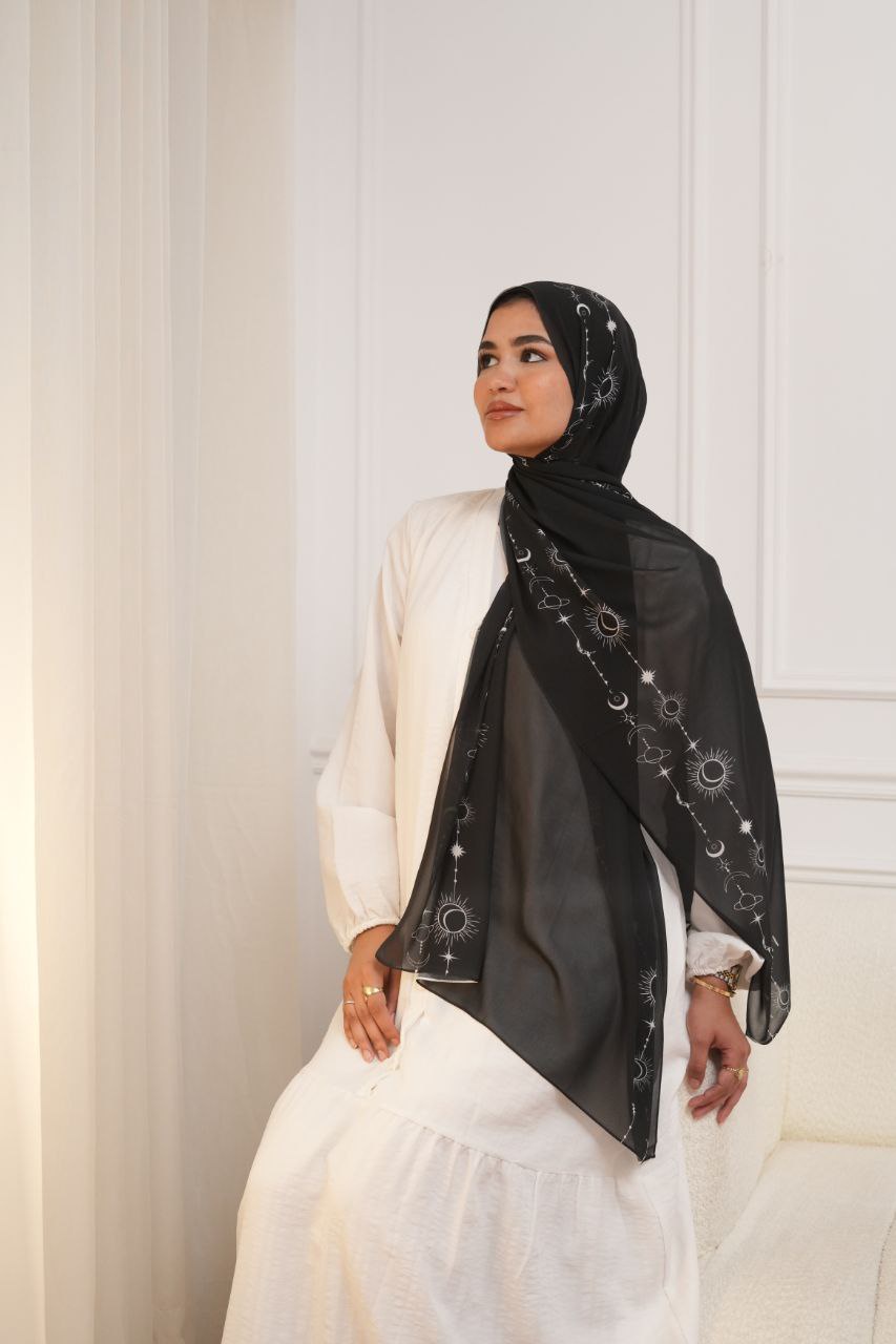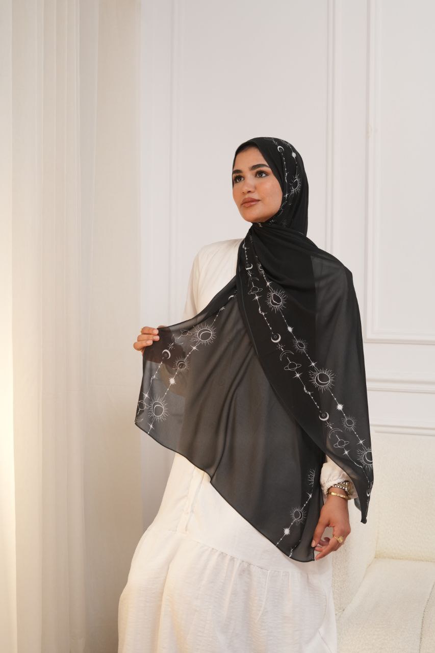 تميّزي بإطلالة جريئة وراقية مع طرحة شيفون ديجيتال أسود بتفاصيل أبيض.