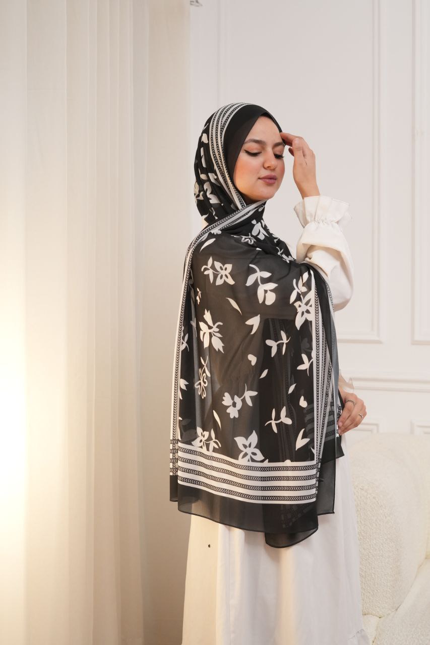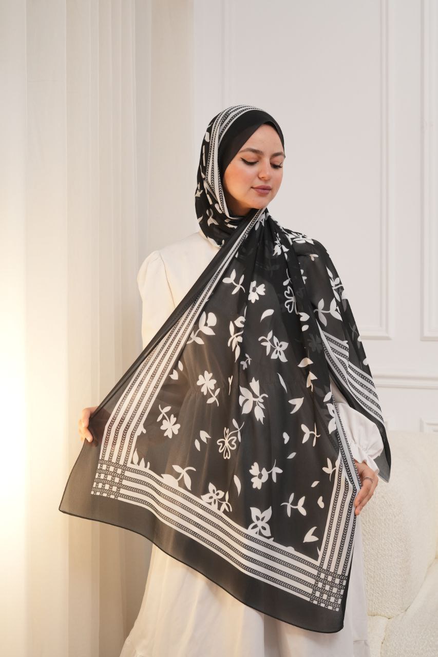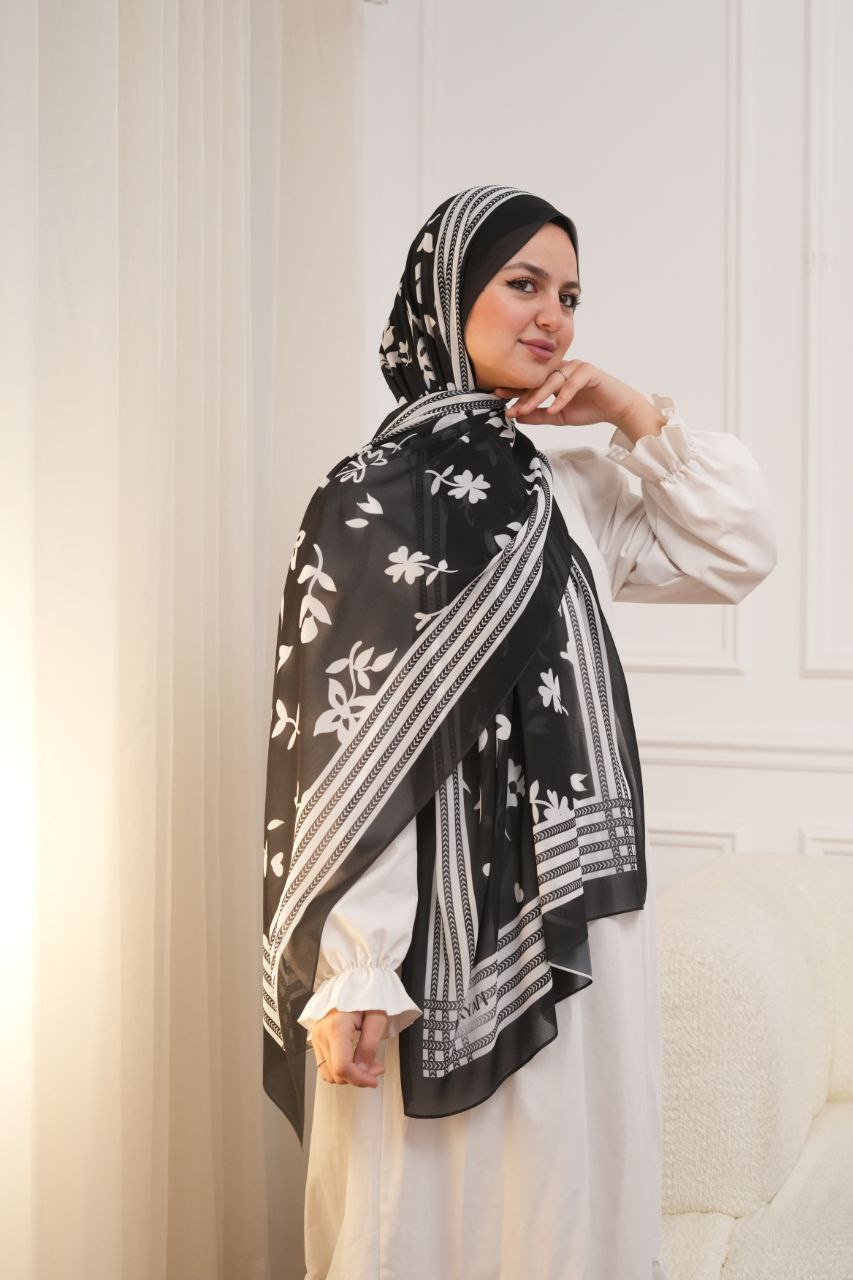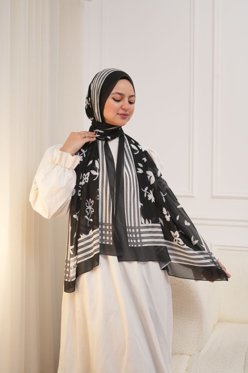 طرحة شيفون ديجيتال أسود وأبيض – خامة كريب ناعمة، مقاس 200×73.5 سم، تصميم كلاسيكي أنيق، مثالية للعمل والخروجات اليومية، خامة خفيفة ومريحة طول اليوم.