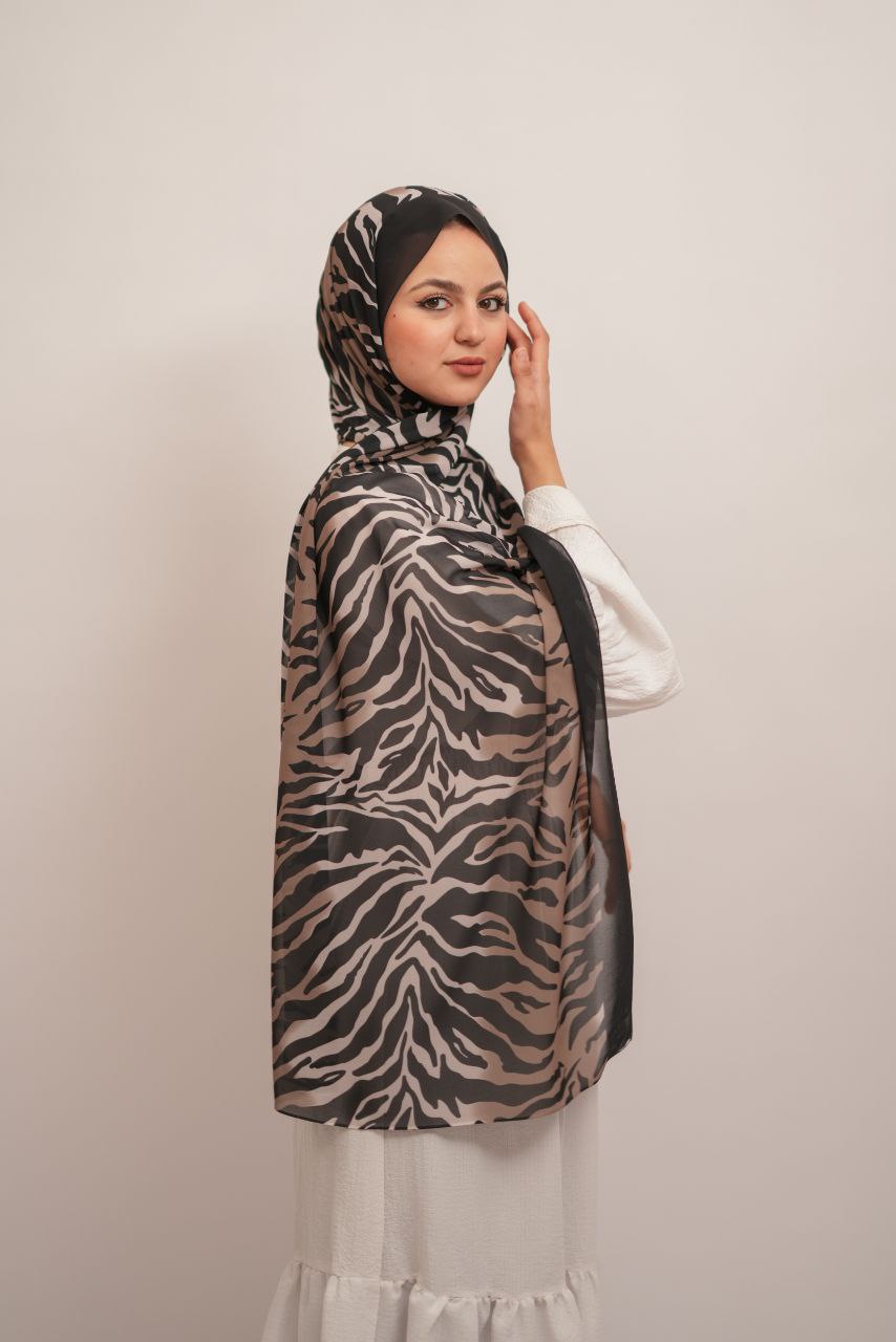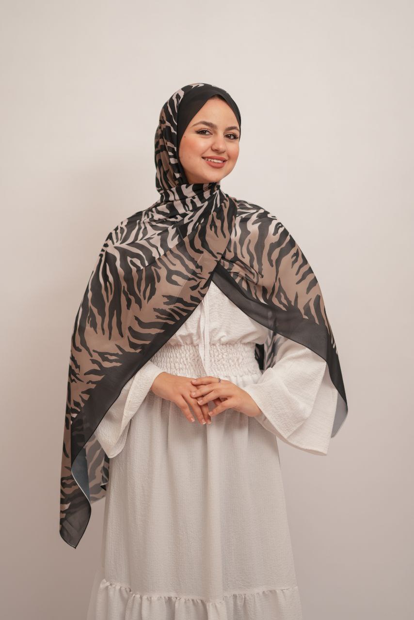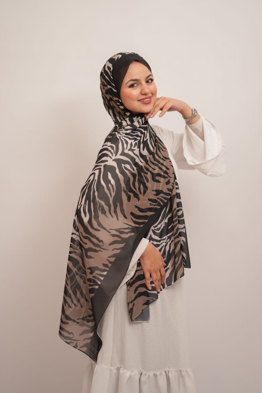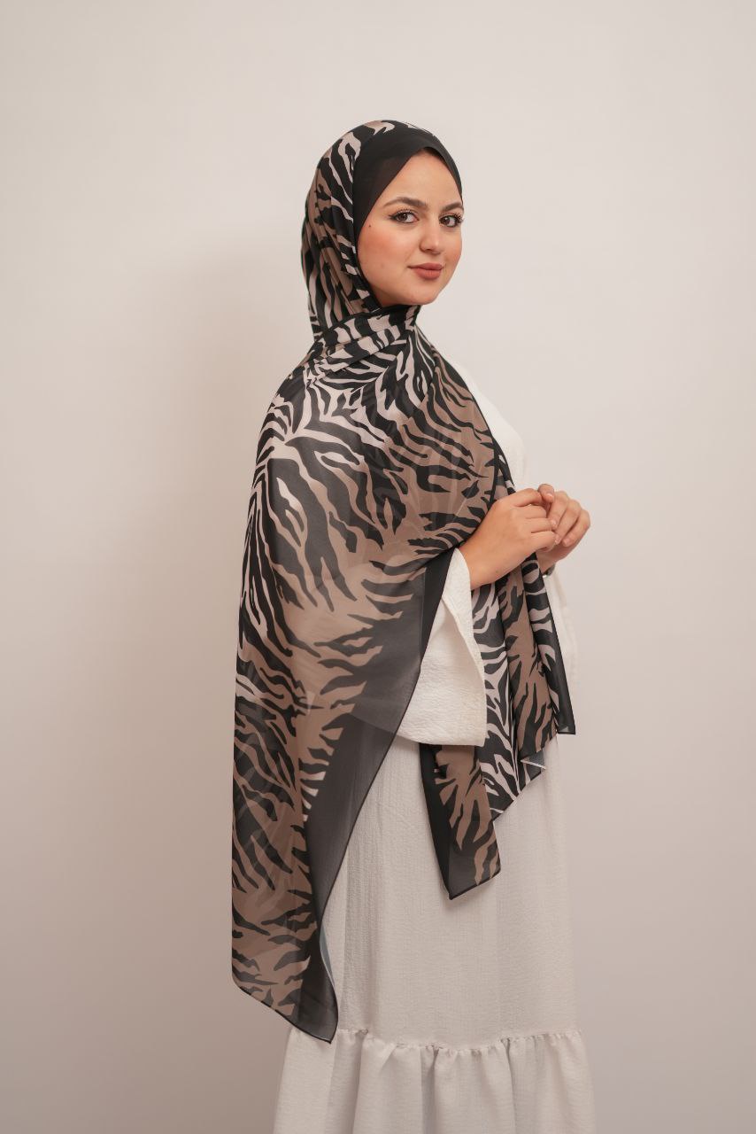 تميّزي بإطلالة قوية وراقية في نفس الوقت مع طرحة شيفون ديجيتال تايجر بني، الطرحة اللي بتجمع بين الأناقة العملية والنقشة الجريئة الكلاسيكية.