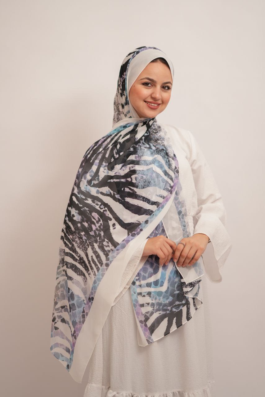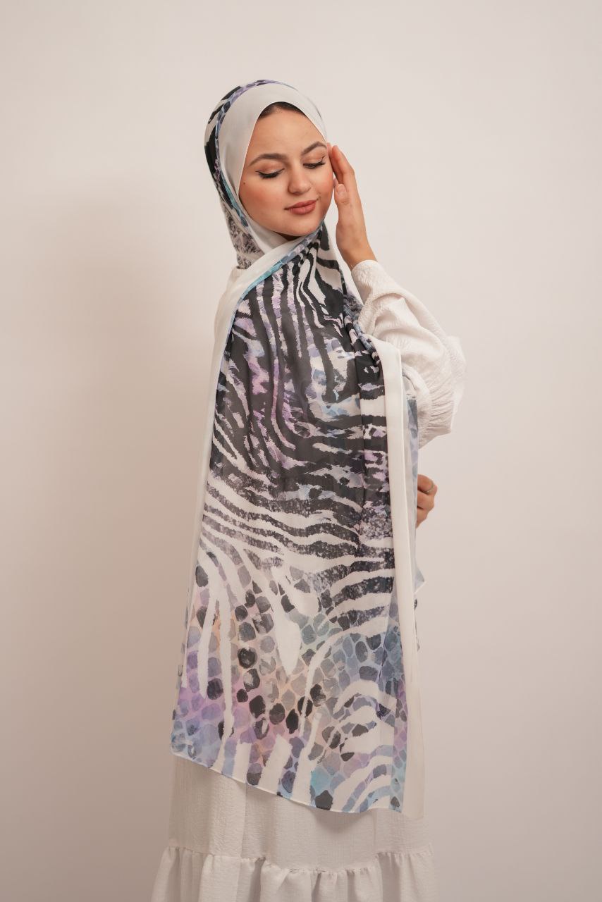النقشة المستوحاة من التايجر الأبيض، مع لمسات ألوان متعددة، بتدي الطرحة شكل عصري ومميز، وتخليها القطعة الأساسية في أي طقم بسيط.