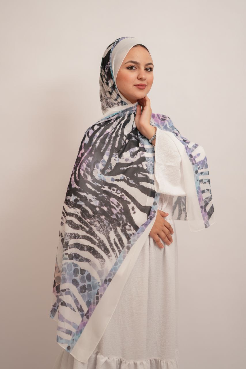 خلي طلتك تِحكي عن شخصيتك مع طرحة شيفون ديجيتال تايجر أبيض ومتعدد الألوان، الطرحة اللي بتجمع بين الجرأة والرقة في تصميم واحد يخطف الأنظار!