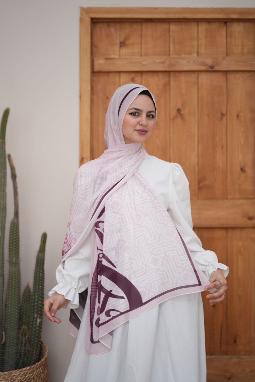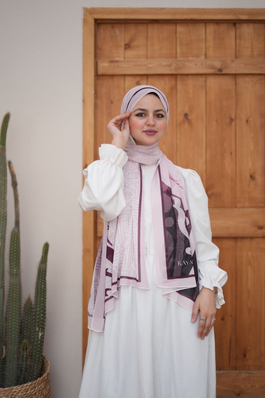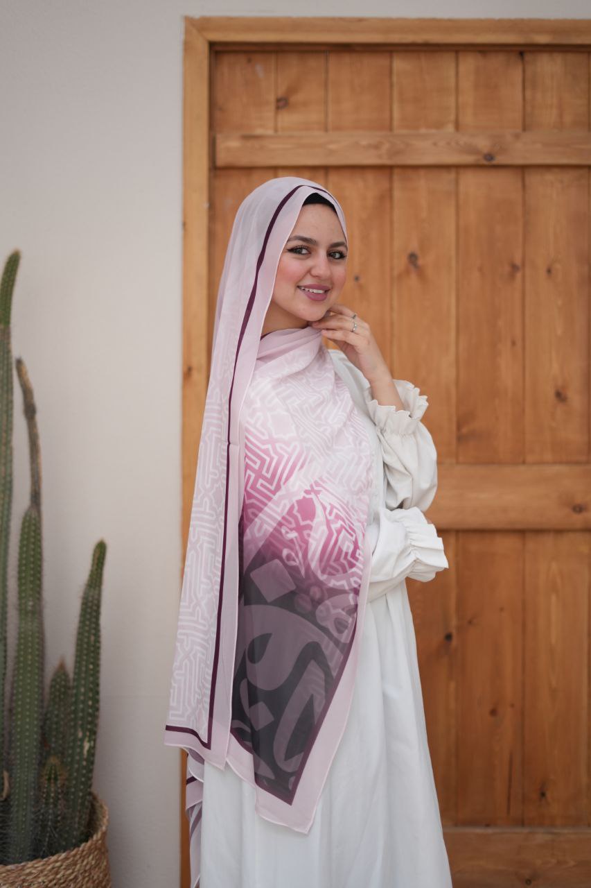 طرحة شيفون ديجيتال أبيض × بنفسجي متدرج – تصميم ناعم بخامة كريب خفيفة، أنيقة ومريحة، تمنحكِ إطلالة راقية ومتناغمة طوال اليوم. مثالية للبس اليومي والمناسبات الهادئة.