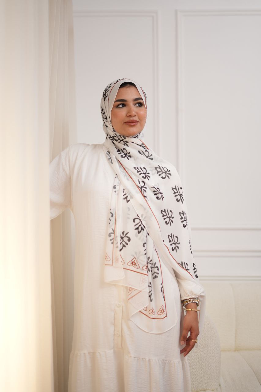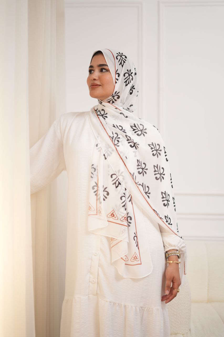 طرحة شيفون ديجيتال أبيض وأسود وأحمر – خامة كريب ناعمة وخفيفة على البشرة، تصميم عصري مميز بستايل جريء، مقاس مثالي وتنسيق أنيق لكل المناسبات.