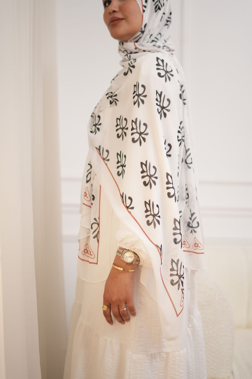 "بجد ألوان الطرحة دي خرافية! فيها أناقة الأبيض والأسود، واللون الأحمر مديها شخصية قوية. لفت انتباه كل اللي شافني، والخامة مريحة جدًا في اللبس."